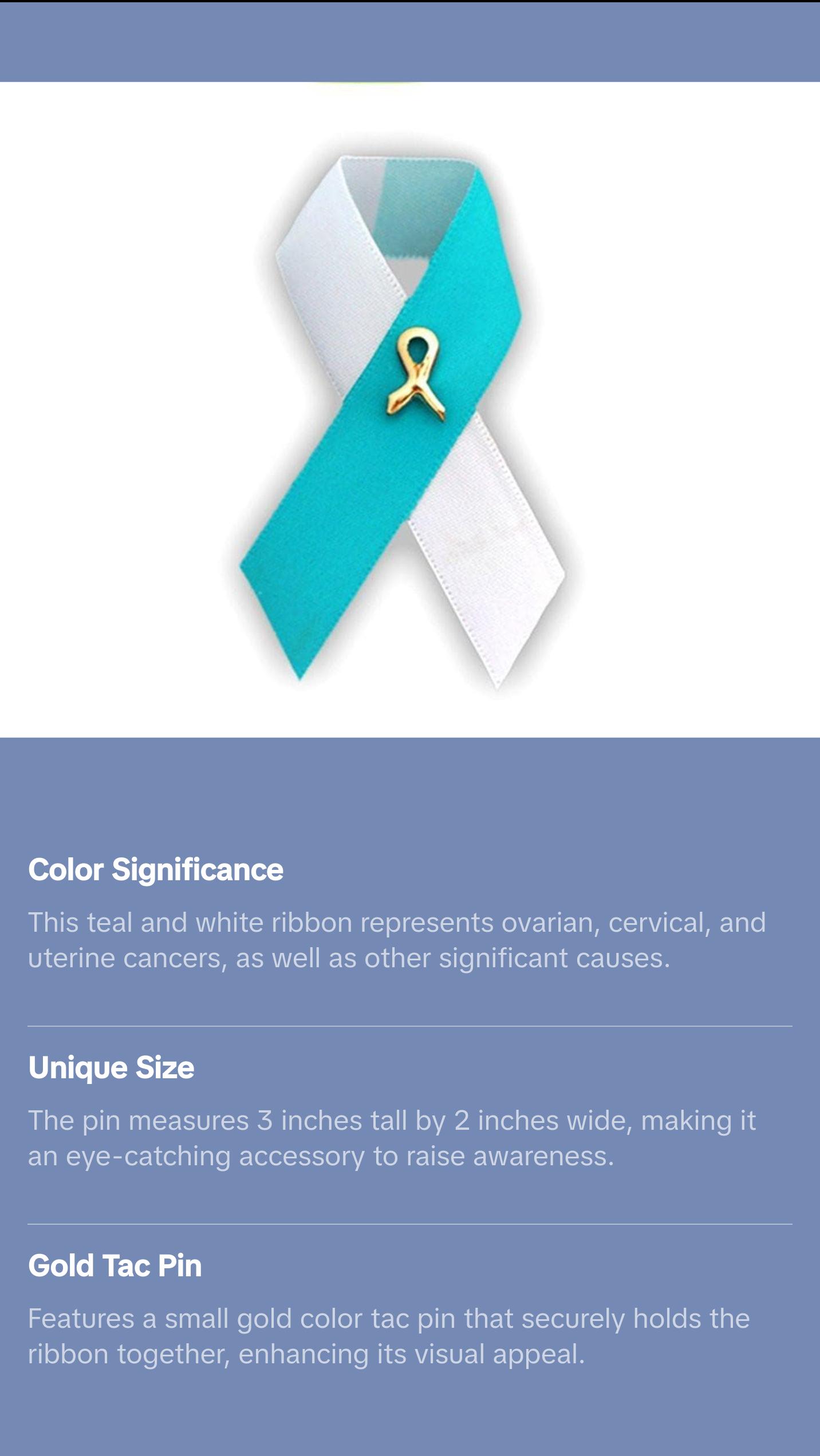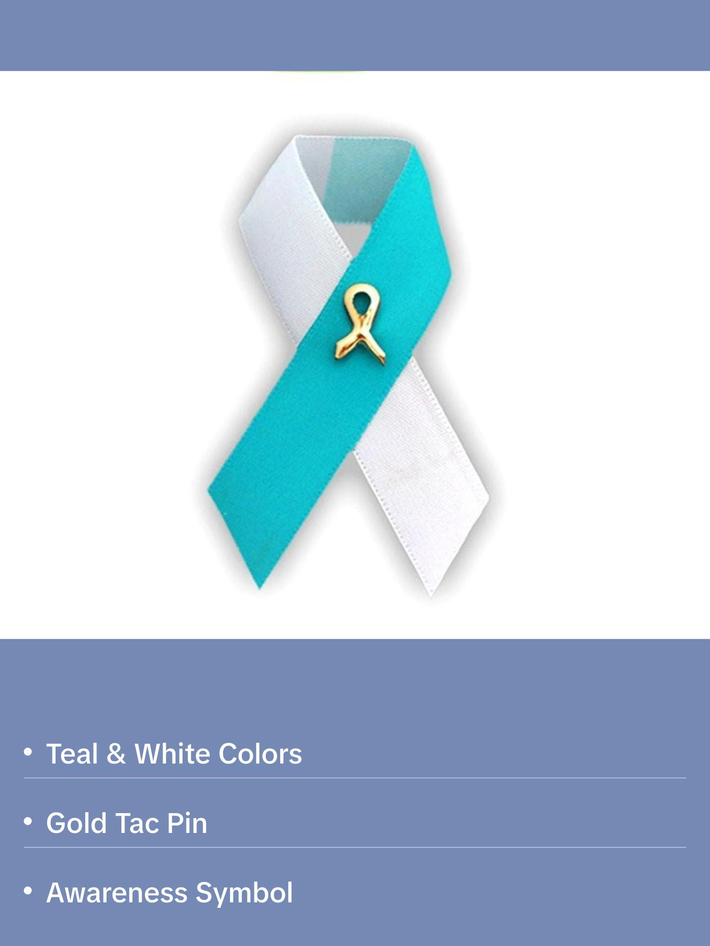 This product includes 10 teal and white cancer awareness ribbon pins, each with a gold ribbon tac pin in the middle. The teal color symbolizes ovarian, cervical, uterine cancers, and other health issues. The pins are perfect for promoting awareness of these health concerns.