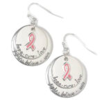 This large pink ribbon charm on a black cord bracelet features a large sterling silver plated pink ribbon charm. The pink ribbon charm is 1/2 inch tall and the black cord bracelet is about 7 1/2 inches with an extension that is about 2 inches. This bracelet closes with a lobster clasp.