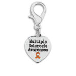 Silver heart charm with a green ribbon and the words “Mental Health Awareness”