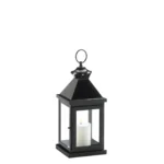 Take your decor to the height of style with this medium black iron candle lantern. Classic lines and clear glass panels make it a surefire way to add timeless chic to your living space. Features top hanging loop and slanted glass roof panels.