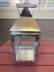 Lantern: 7½” x 2″ x 8″ high; stand: 14″ high. Weight 1.4 lbs. Iron, Glass. Candle not included. UPC: 849179001407.