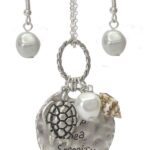 The necklace is 18 inches with an extension. Pendant says, “Love you to the beach and back.” This set comes with a white bead on each earring. The necklace has a pendant, white bead on it, starfish, and a shell. This starfish pendant necklace and earring set works for adults as well as children. Notice the exquisite detail. Sea animals are fun to wear!